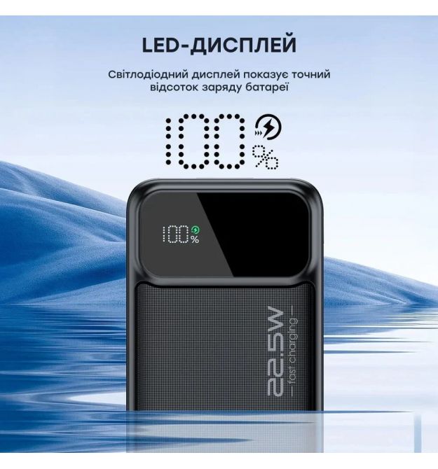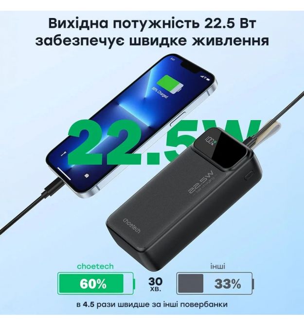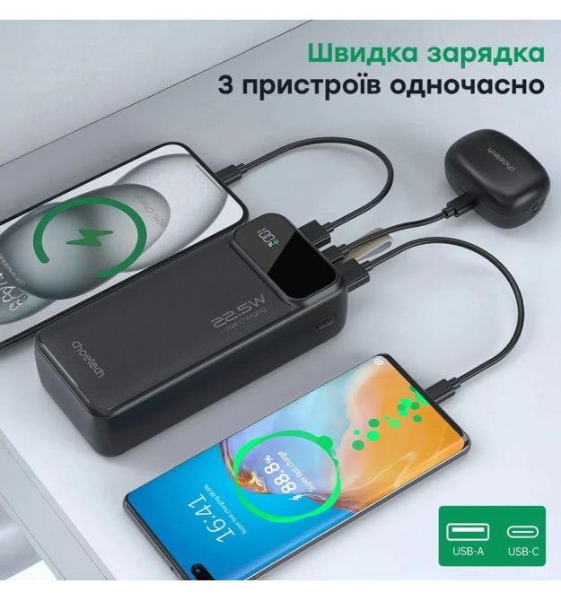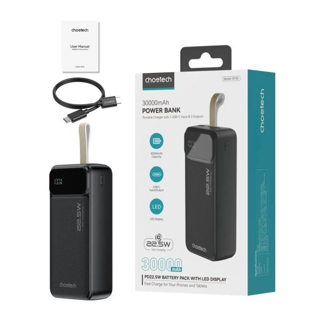 Описание товара Повербанк 30000 mAh Choetech B730 Black 22.5W QC3.0 PD3.0Повербанк Choetech B730 с емкостью батареи 30000 мАч, литий-полимерной технологией, интерфейсы: вход/выход Type-C: вход 5V/2.4A, 9V/2A, 12V/1.5 (18 Вт макс.), выход 5V/3A, 9V/2.2A, 12V/1.67A (20 Вт макс.); выходы: USB-A1/A2 5V/3A, 10V/2.25A, 12/1.A.5 Вт.). Поддерживает скоростную зарядку по протоколам QC3.0/QC2.0, PD3.0/PD2.0, AFC, FCP. Двусторонний порт Type-C обеспечивает как зарядку устройств, так и самого повербанка. Оснащен LED-дисплеем для отображения состояния заряда. В комплекте – кабель Type-C to Type-C.ПрименениеPower Bank Choetech B730 используется для зарядки смартфонов, планшетов, смарт-часов, наушников и других портативных устройств, которые нуждаются в быстрой и эффективной зарядке в условиях отсутствия стационарного питания.Функциональные преимуществаБольшая емкость: с емкостью 30000 мАч повербанк позволяет заряжать смартфоны и другие устройства (с батареей средней емкости, учитывая потери энергии) до 6 раз, что делает его идеальным для длительных поездок. Возможность зарядки трех устройств одновременно: оснащен тремя выходами (USB-A1, USB-A2 и USB-C), что делает его универсальным для одновременной зарядки нескольких устройств. Быстрая зарядка: поддерживает скоростную зарядку до 22.5 Вт, что позволяет зарядить смартфон до 60% за 30 минут. Поддержка протоколов быстрой зарядки: Power Bank совместим с такими протоколами, как QC3.0/QC2.0 (Quick Charge от Qualcomm для быстрой зарядки), PD3.0/PD2.0 (Power Delivery – универсальный стандарт для различных устройств), AFC (Adaptive Fast Charging – для быстрой зарядки от Samsung), FCP (протокол быстрой зарядки от Huawei). Эти технологии позволяют максимально быстро и безопасно заряжать совместимые устройства. Двусторонний порт Type-C: этот порт позволяет не только заряжать подключенные устройства, но и одновременно заряжать сам повербанк от сети, что значительно повышает удобство использования. Индикатор заряда: LED дисплей четко отображает остаточный уровень заряда, что позволяет своевременно зарядить повербанк. Максимальный уровень безопасности: многоуровневая защита от перезаряда, чрезмерного тока, перенапряжения и короткого замыкания обеспечивает безопасное использование устройства. Компактний дизайн: не смотря на большую емкость повербанк остается компактным – 150 / 67.9 / 40.3 мм и весит 607 г, что позволяет удобно переносить его.Ключевые свойства и возможностиЕмкость батареи 30000 мАч, тип – литий-полимерная (Li-pol). Интерфейсы: вход/выход Type-C: вход 5V/2.4A, 9V/2A, 12V/1.5 (18 Вт макс.), выход 5V/3A, 9V/2.22A, 12V/1.67A (20 Вт макс.); виходи USB-A1/A2: 5V/3A, 10V/2.25A, 12V/1.5A (макс. 22.5 Вт); общая мощность при использовании USB-C + USB-A1 + USB-A2: 5V/3A (15 Вт макс.). Поддержка быстрой зарядки по протоколам QC3.0/QC2.0, PD3.0/PD2.0, AFC, FCP. LED-дисплей для отображения состояния заряда. USB-кабель Type-C to Type-C в комплекте.