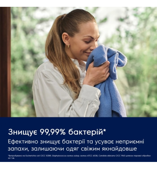 Поверните одежду свежесть с помощью пара. Отпариватель эффективно уничтожает 99,99% бактерий и устраняет неприятный запах, поддерживая свежесть одежды еще дольше.