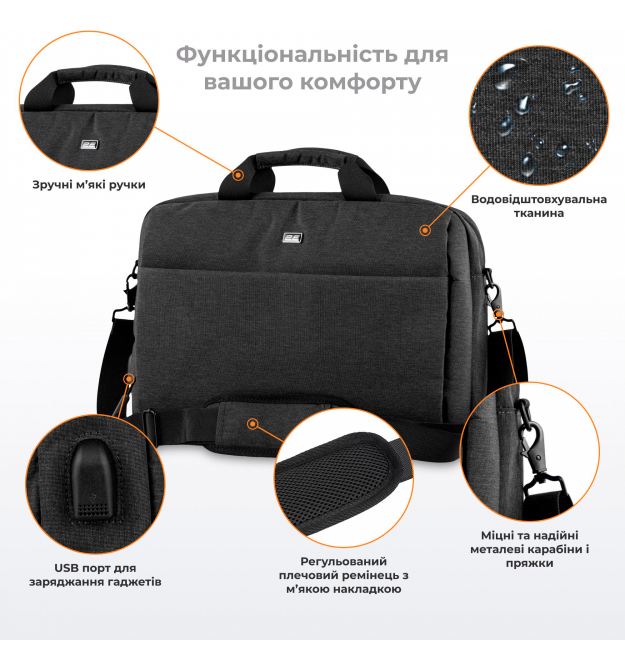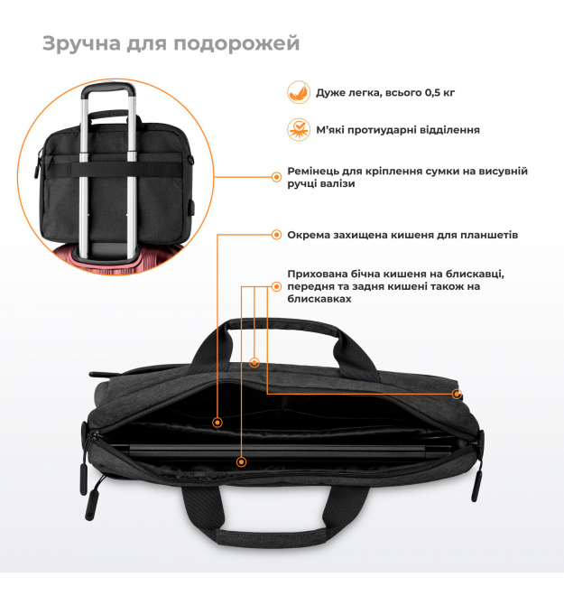 С отдельными карманоми для ноутбука и планшета/электронной книги, а так же 2 небольших кармана для аксессуаров;