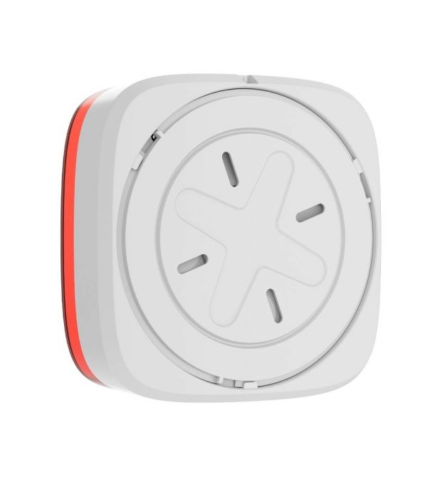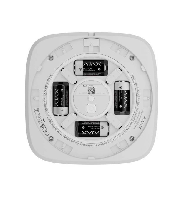 Конструкция оснащена системой защиты от саботажа: встроенный тампер реагирует на демонтаж, а замок SmartBracket предотвращает несанкционированное снятие. Питание обеспечивают четыре литиевые батареи CR123A, которые входят в комплект и позволяют устройству работать до пяти лет. При необходимости замена батарей выполняется без инструментов, а защита от обратной полярности предотвращает ошибки при установке. Доступные цветовые варианты позволяют использовать оповещатель в различных интерьерах и условиях эксплуатации