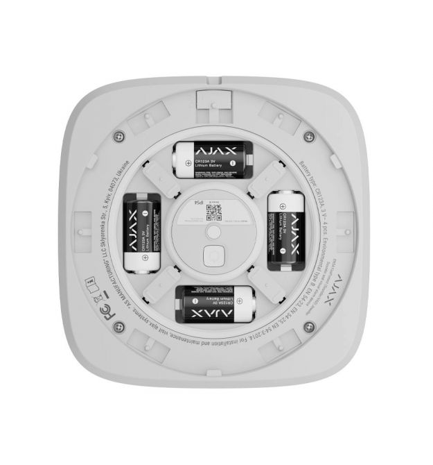 Защита от саботажа реализована с помощью встроенного тампера и замка SmartBracket, который предотвращает демонтаж без специального инструмента. Питание обеспечивают четыре литиевые батареи CR123A, входящие в комплект, что позволяет устройству работать до пяти лет. Замена элементов питания выполняется без инструментов, а встроенная защита от обратной полярности исключает ошибки при установке. Благодаря универсальному сочетанию звукового и светового оповещения FireProtect (Sounder/VAD) Jeweller обеспечивает максимально эффективное реагирование на пожарные тревоги