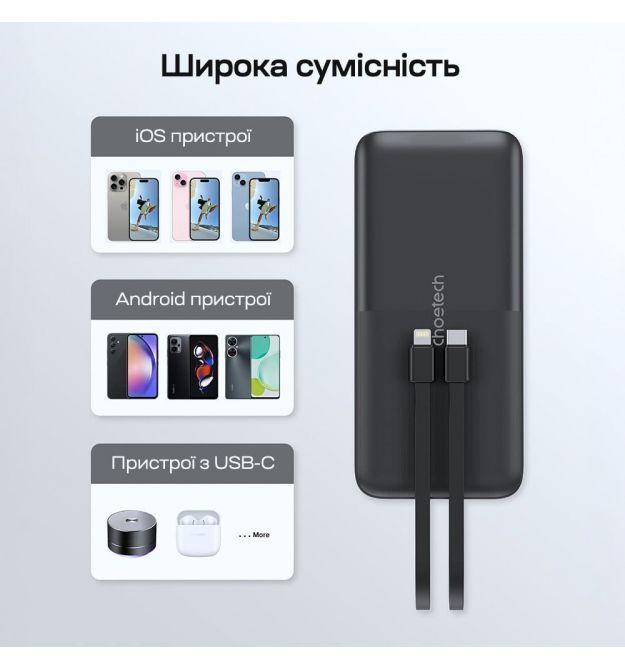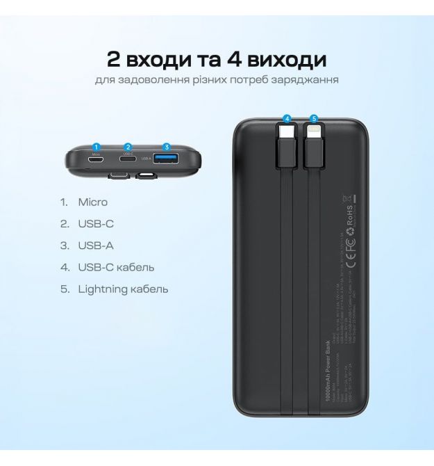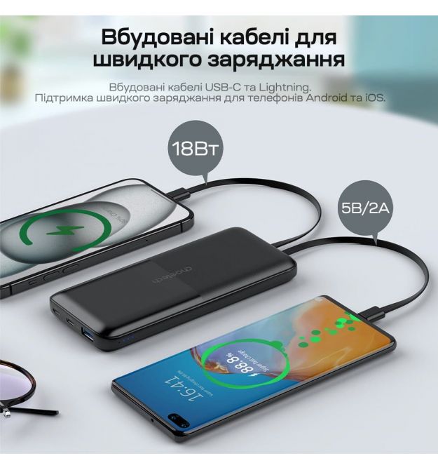 | Особенности | Вбудовані кабелі, Швидка зарядка PD3.0, Швидка зарядка QC3.0 |
