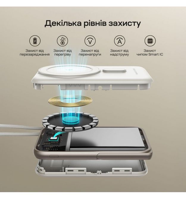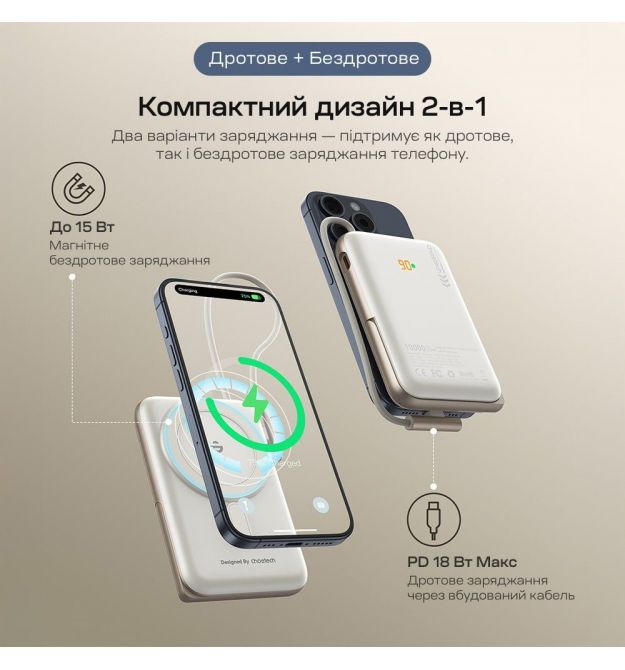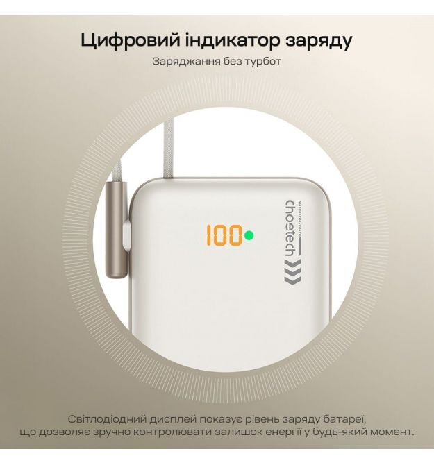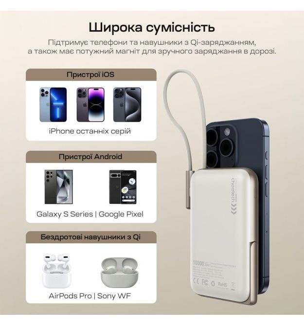 | Особенности | Бездротова зарядка, Вбудовані кабелі, Підставка, Швидка зарядка PD3.0, Швидка зарядка QC3.0 |