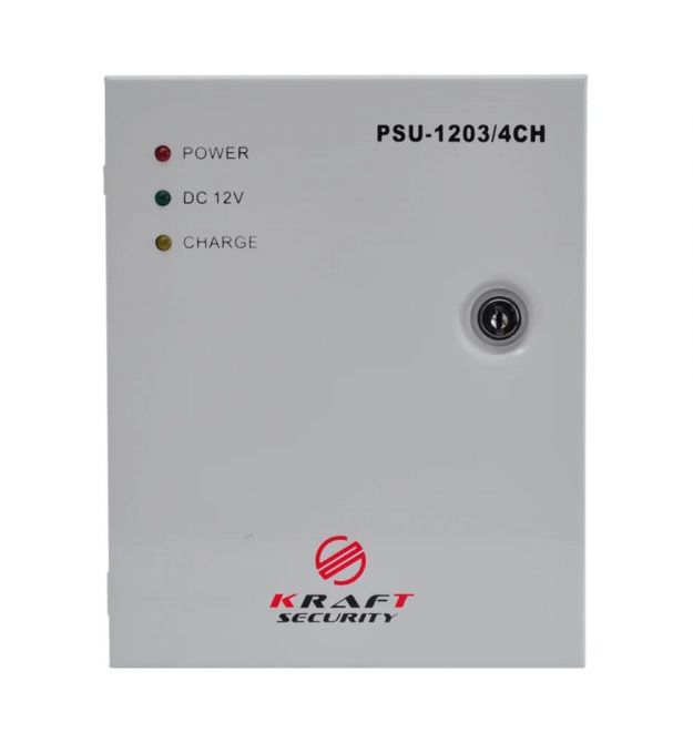 Блок безперебійного живлення імпульсний Kraft PSU-1203/4CH з 4 каналами навантаження, LED-індикацією, у металевому боксі з місцем під акумуляторну батарею 18 Аг, номінальні вихідна напруга/струм 12 В/3 А, вхідна напруга 190-265 В.