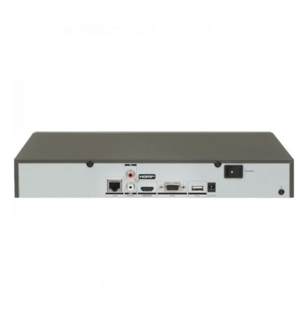 З'єднання здійснюється через гігабітний порт Ethernet. Один SATA-інтерфейс підтримує жорсткий диск до 16 ТБ. Також передбачено два порти USB 2.0 та тривожні входи/виходи (4/1) для підключення охоронних датчиків та сирен.