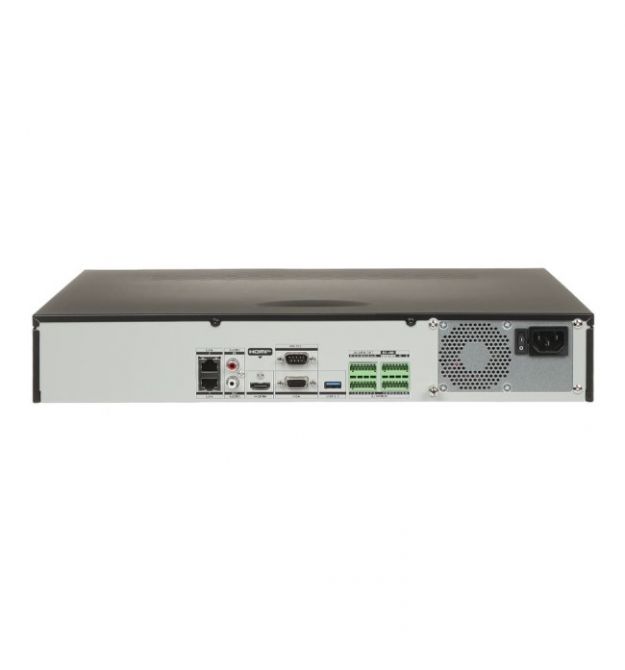 Пристрій оснащено чотирма SATA-роз'ємами для встановлення жорстких дисків загальним обсягом до 64 ТБ, що гарантує тривале зберігання записів. Інтерфейси підключення включають 2 порти Ethernet 10/100/1000 Мбіт/с, три USB (два 2.0 і один 3.0), а також роз'єми RS232 і RS485 для зовнішньої інтеграції.