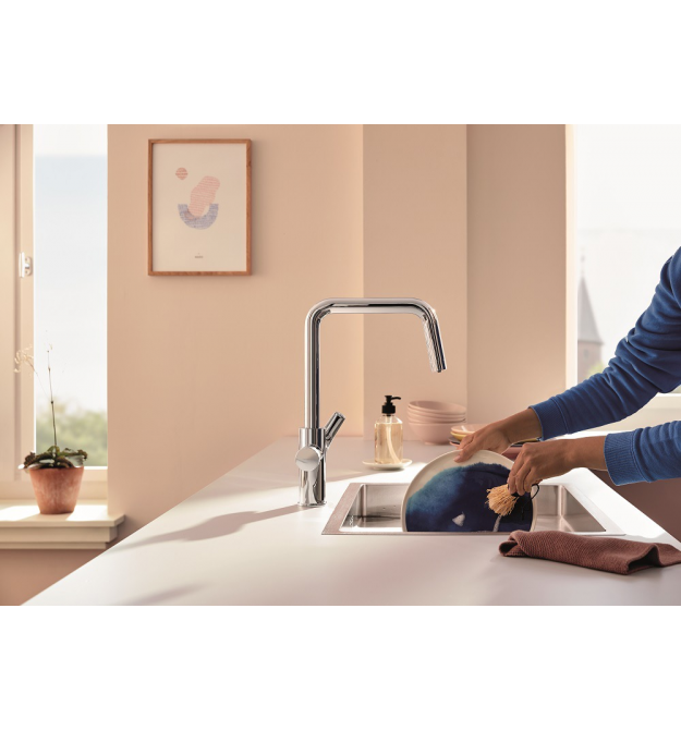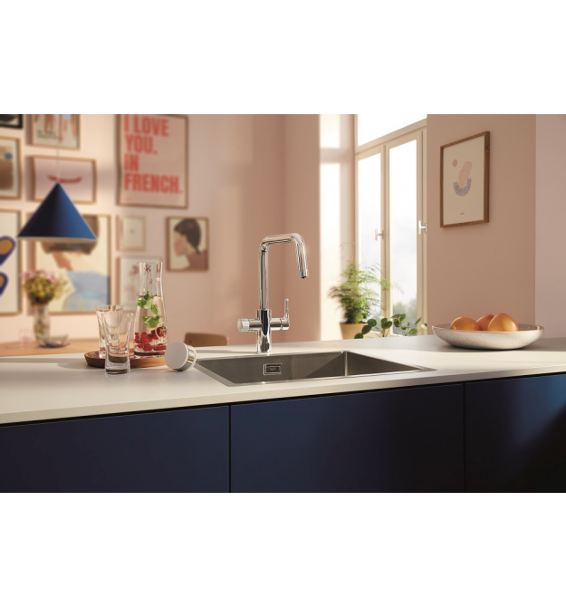 Оновлений дизайн забезпечує більш зручне управління: рифлена поворотна ручка для отримання смачної питної води тепер знаходиться на одному рівні з одноважільною ручкою, що подає змішану нефільтровану воду для щоденних кухонних справ. Усередині є керамічний картридж Grohe SilkMove, який забезпечує точне регулювання об'єму і температури водопровідної води.