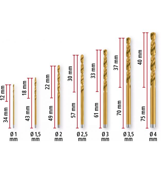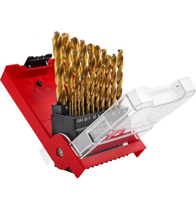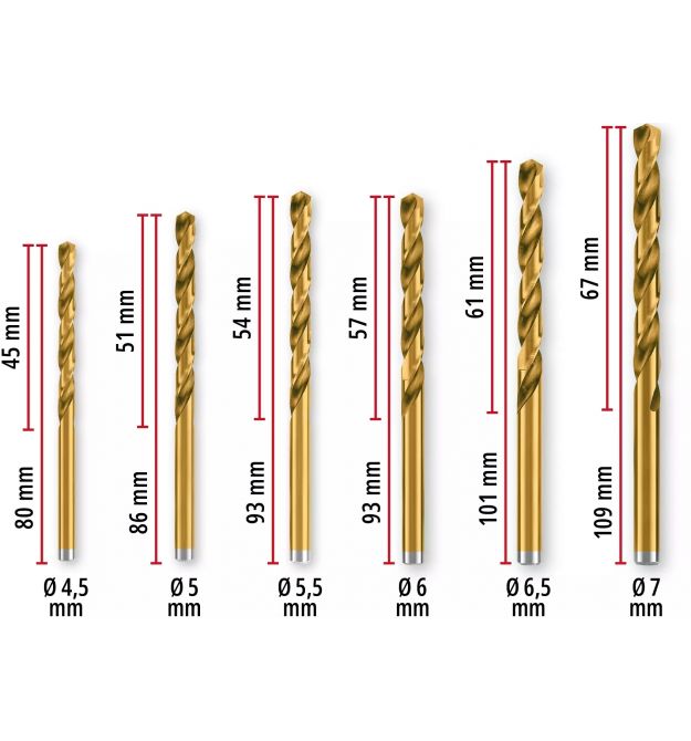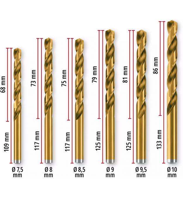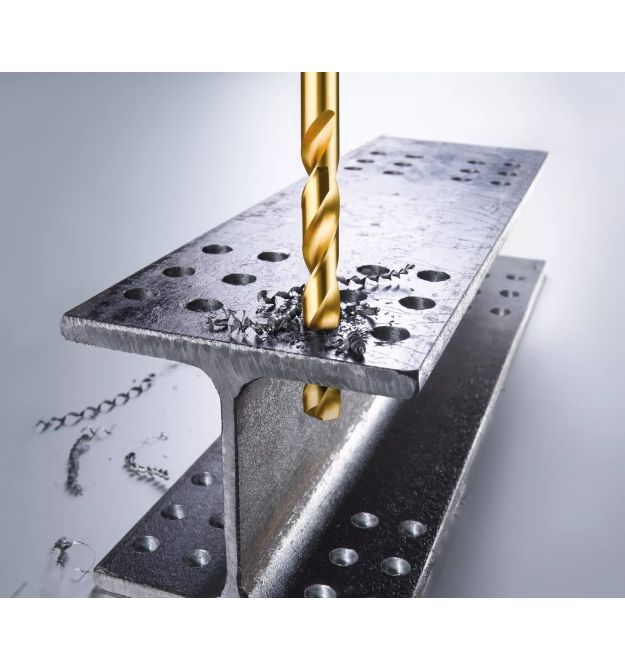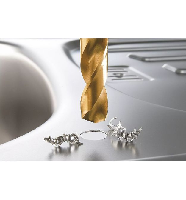 Завдяки азотуванню титану набір свердел HSS для свердління металу має значно вищу твердість і зносостійкість. Завдяки цьому свердла з титановим покриттям мають золотистий колір.