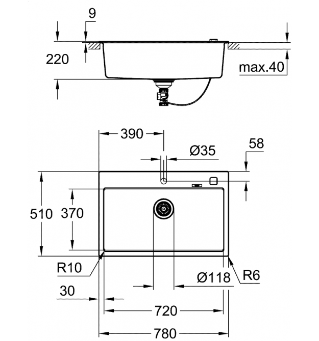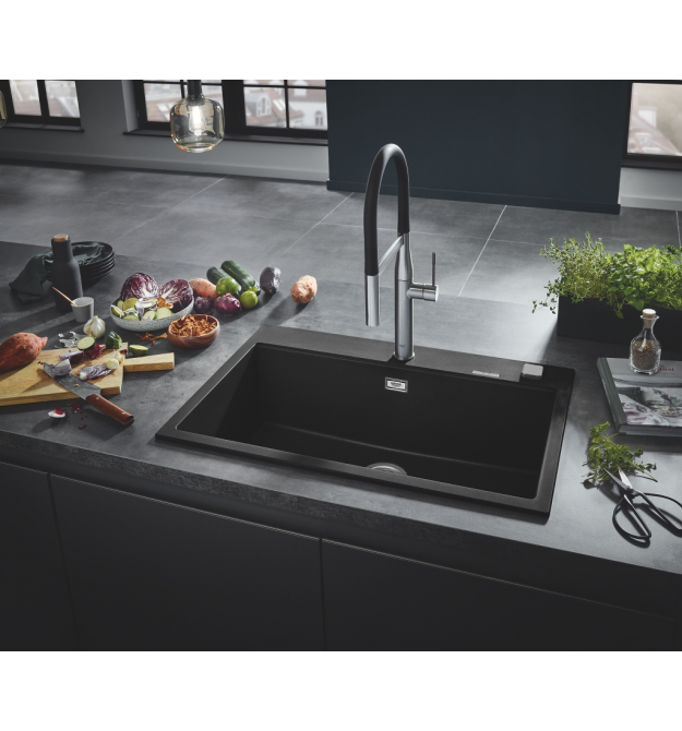 Прямокутна кухонна мийка 31652AP0 від Grohe виготовлена з високоякісного кварцового композиту в кольорі "чорний граніт", та оснащена місткою чашею розміром 72 х 37 х 22 см .