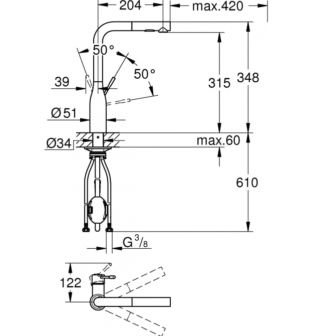 | Тип виливу | поворотний, з висувним виливом |