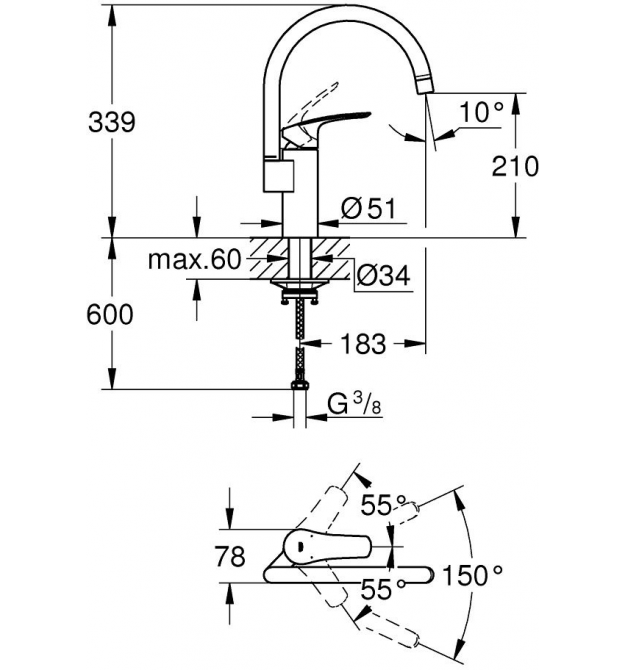 Стиль поєднується з продуктивністю у змішувачі для кухні. Змішувач стане привабливим акцентом у вашому просторі. Ретельно продуманий до дрібниць, він пропонує неперевершену універсальність. Він оснащений регульованим поворотним механізмом на 150°, це дозволяє зафіксувати вилив у потрібному положенні. Керамічний картридж Grohe SilkMove забезпечує плавний і точний контроль води та температури протягом усього терміну служби. Змішувач буде виглядати бездоганно протягом багатьох років, оскільки він має міцне покриття Grohe StarLight для додаткового рівня стійкості до подряпин.