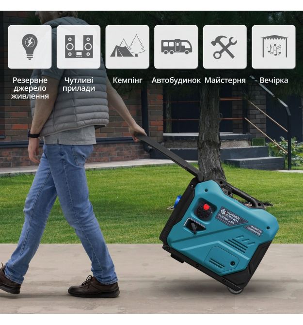 Корпус обладнаний системою транспортування для зручності переміщення, завдяки чому поле використання значно розширюється. Два колеса та ручка, що підіймається під час переміщення генератора, забезпечують комфортне транспортування та мобільність агрегата.