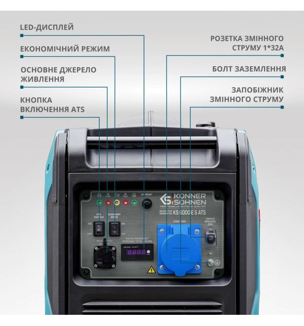 Ергономічна панель керування оснащена: LED-дисплеєм, перемикачем економічного режиму, а також кнопкою Reset для перезавантаження системи контролю (при спрацьовуванні автомата захисту) та відновлення напруги. Контроль всіх ключових показників робочого стану: захист від перевантажень, автоматична зупинка при низькому рівні мастила.