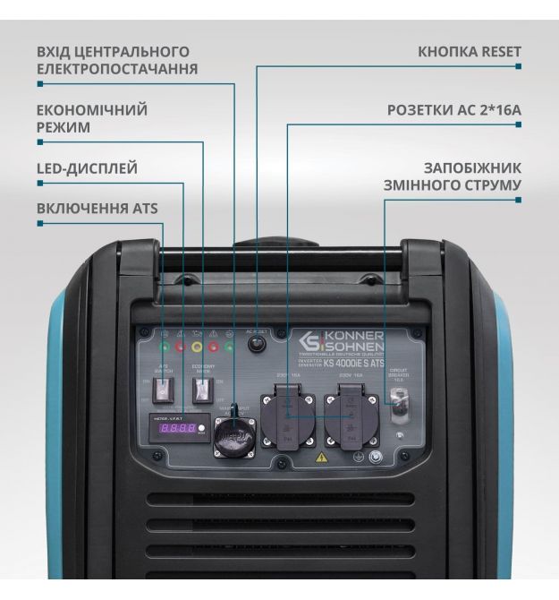 Ергономічна панель керування оснащена: LED-дисплеєм, перемикачем економічного режиму, а також кнопкою Reset для перезавантаження системи контролю (у разі спрацьовування автомата захисту) і відновлення напруги. Контроль усіх ключових показників робочого стану: захист від перевантажень, автоматична зупинка за низького рівня масла.