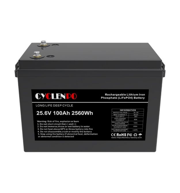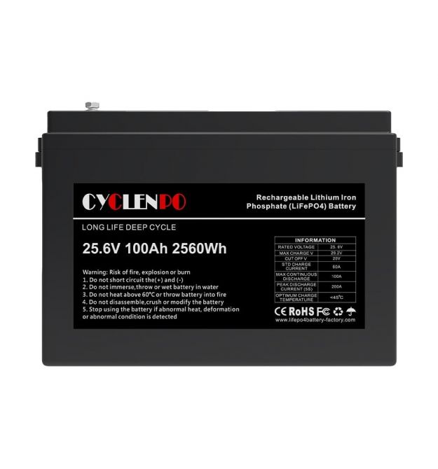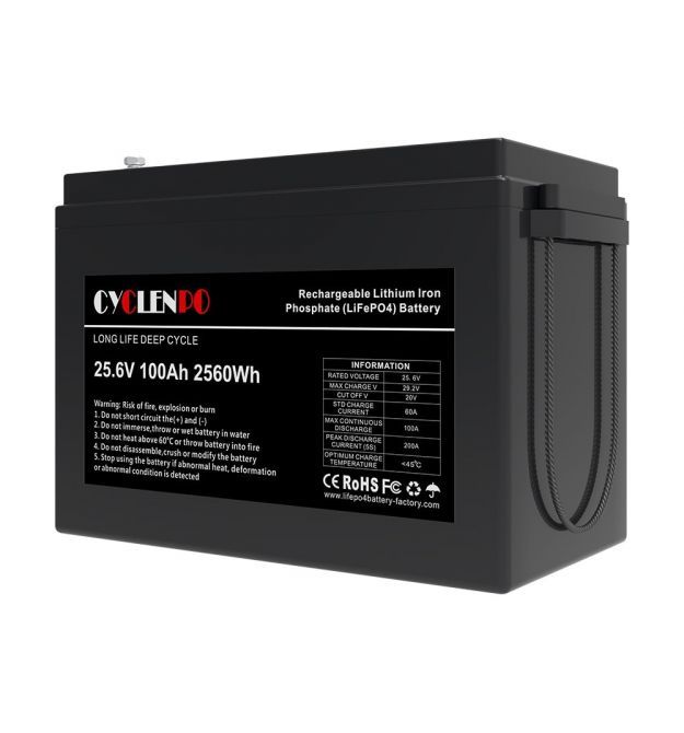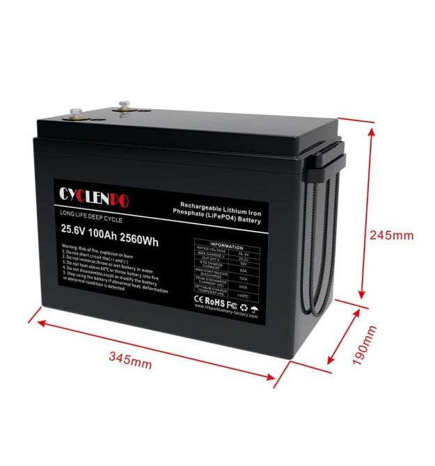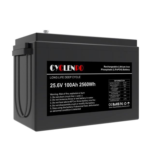 Цей акумулятор — літій-залізо-фосфатна (LiFePO4) батарея з номінальною напругою 25,6 В і ємністю 100 А·год (≈ 2560 Вт·год). Така напруга відповідає стандартним 24 В електричним системам, що робить його універсальним для багатьох застосувань — від автономного живлення до резервних систем.