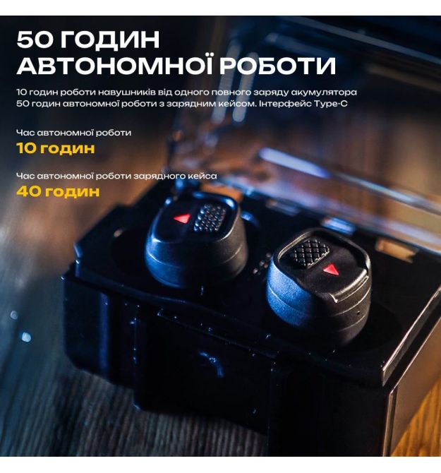 | Час роботи від батареї/акумулятора, год | 10 від акумулятора навушників + 40 від зарядного чохла |