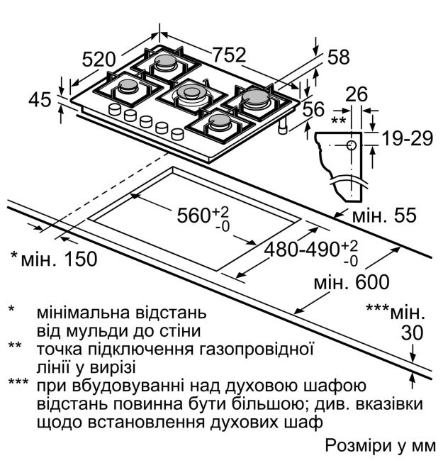 | Розміри для вбудовування | 45 x 560 x (480 - 490) |